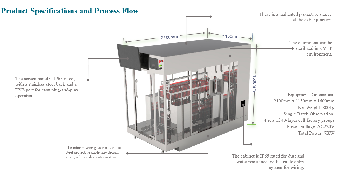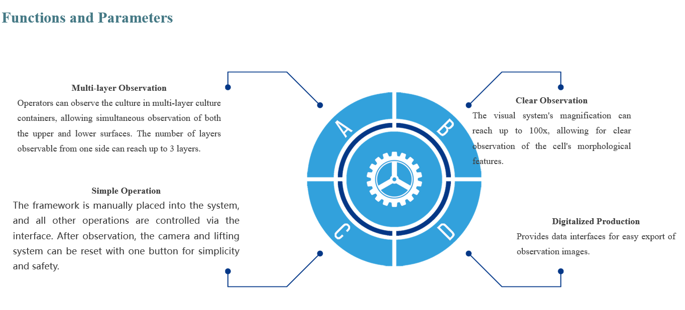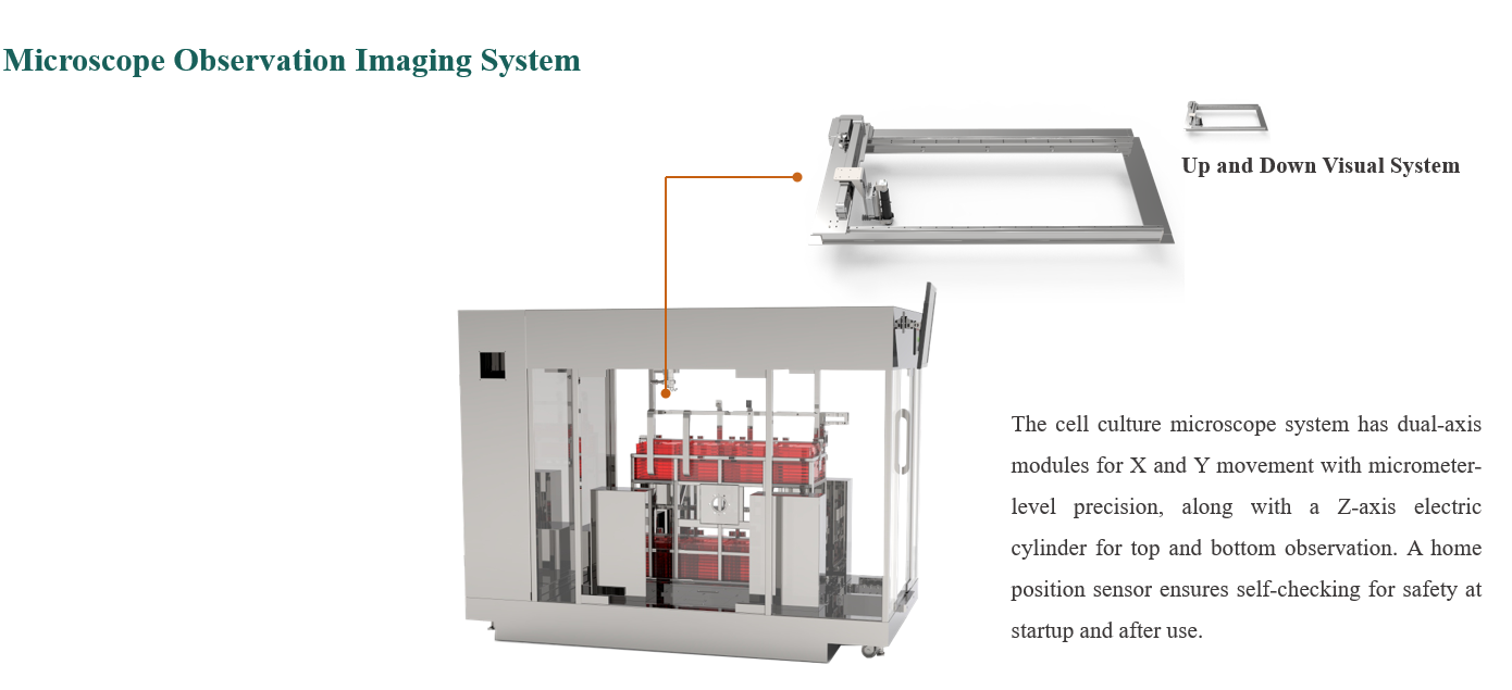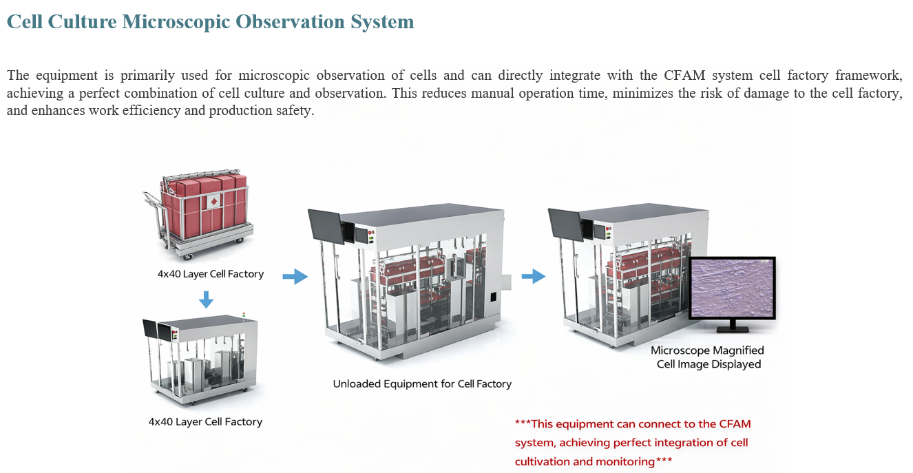 The equipment is primarily used for microscopic observation of cells and can directly integrate with the CFAM system cell factory framework, achieving a perfect combination of cell culture and observation. This reduces manual operation time, minimizes the risk of damage to the cell factory, and enhances work efficiency and production safety.